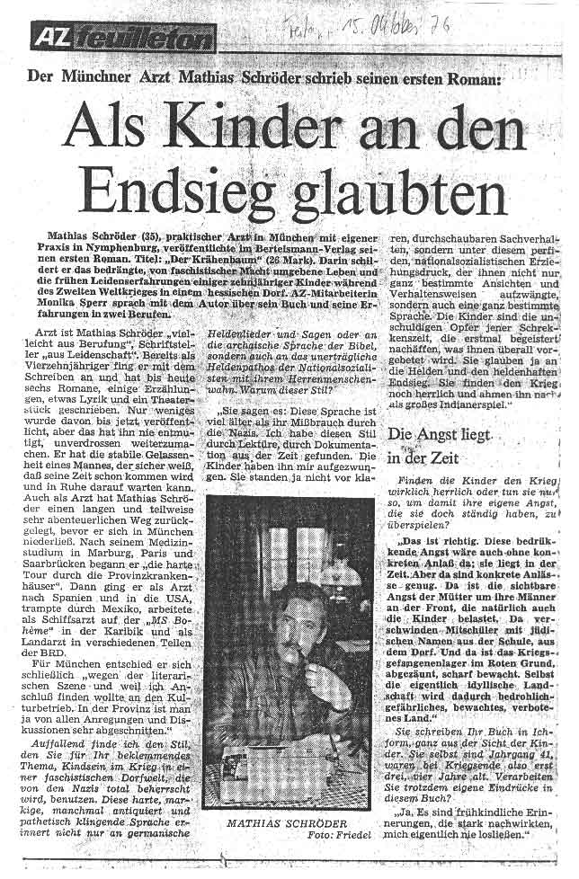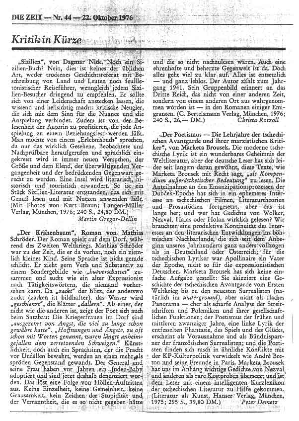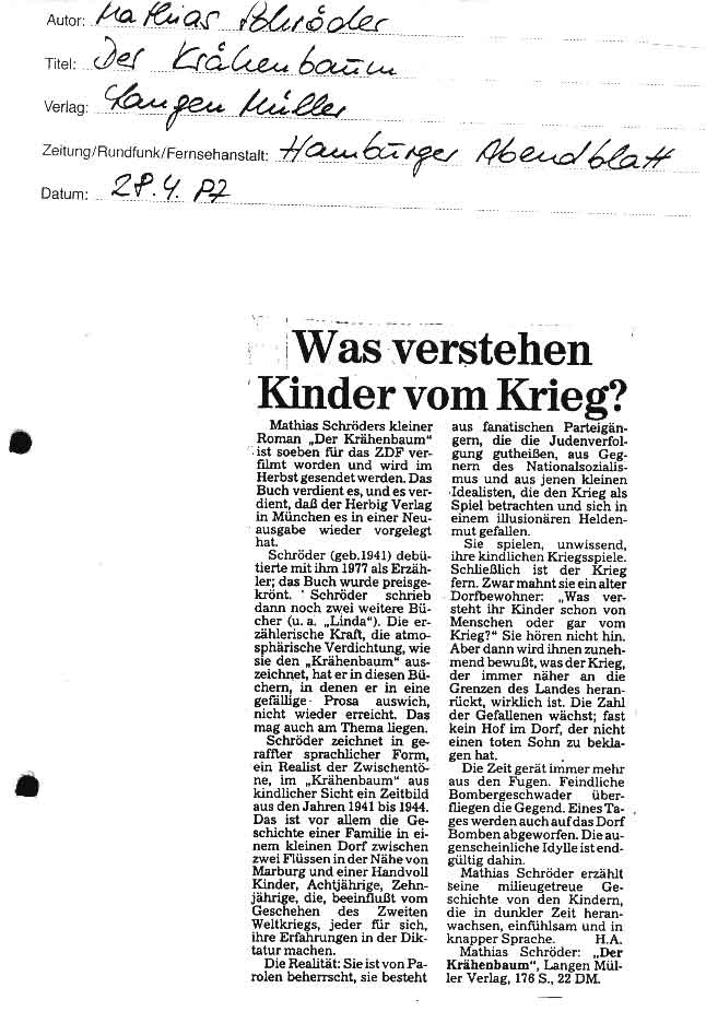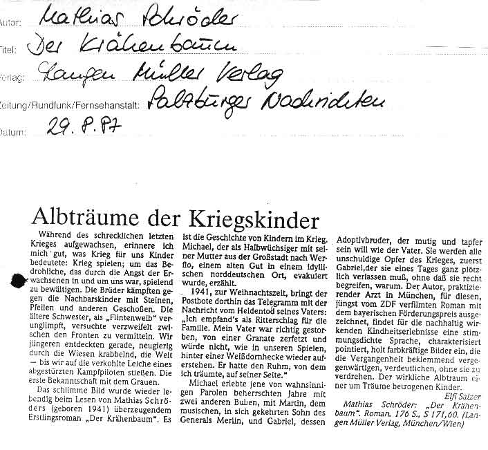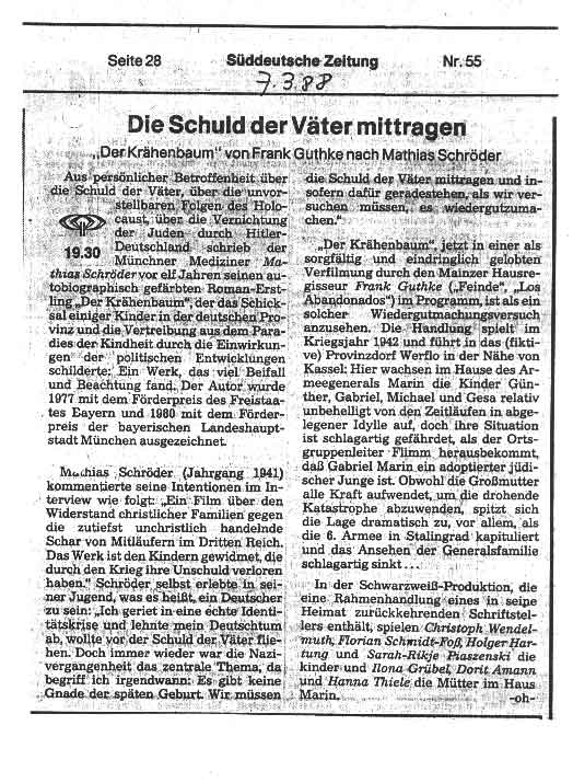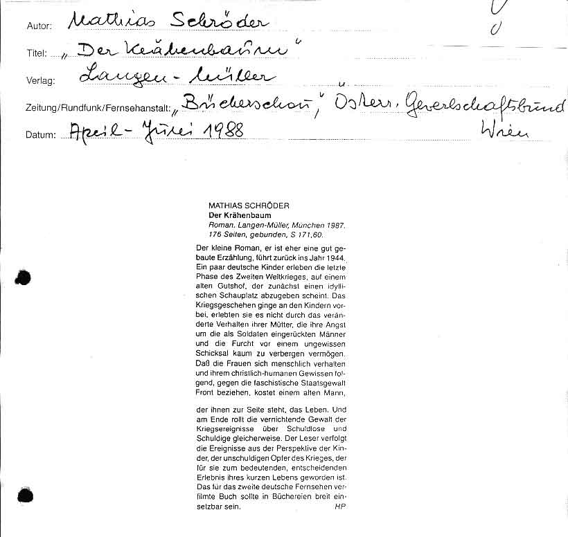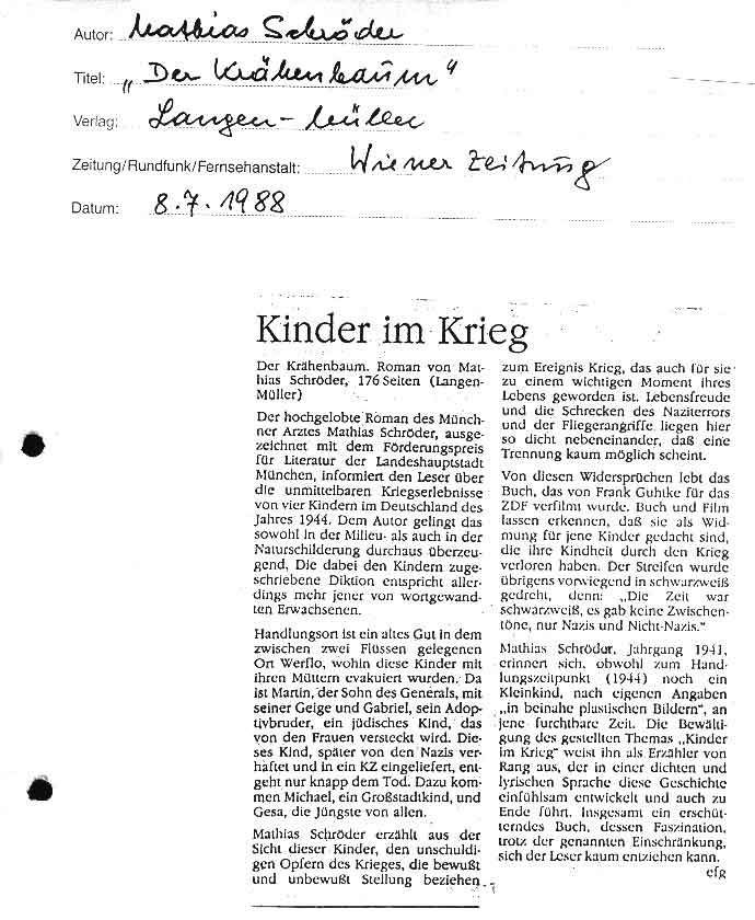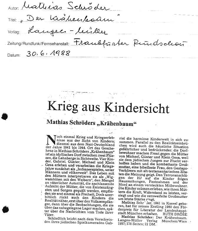 "Der Krähenbaum" 08.07.1988 Wiener Zeitung - 73kb "Der Krähenbaum" 30.06.1988 Frankfurter Rundschau - 65kb "Der Krähenbaum" April 1988 Österr.Gewerkschaftsbund - 48kb "Der Krähenbaum" 07.03.1988 Süddeutsche Zeitung - 76kb "Der Krähenbaum" 29.08.1987 Salzburger Nachrichten -72kb "Der Krähenbaum" 28.04.1987 Hamburger Abendblatt - 75kb "Der Krähenbaum" 22.10.1976 Die Zeit - 120kb "Der Krähenbaum" 15.10.1976 Abendzeitung - 126kb